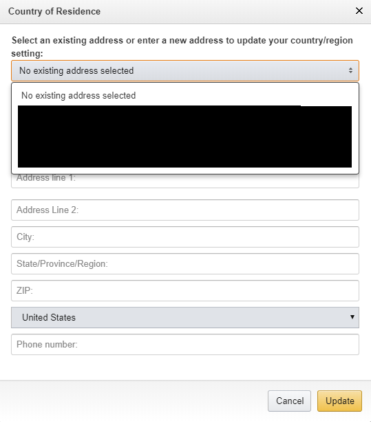No existing address selected로 표시된 항목을 눌러 적절한 미국 주소로 변경 후 Update를 눌러 저장한다.
