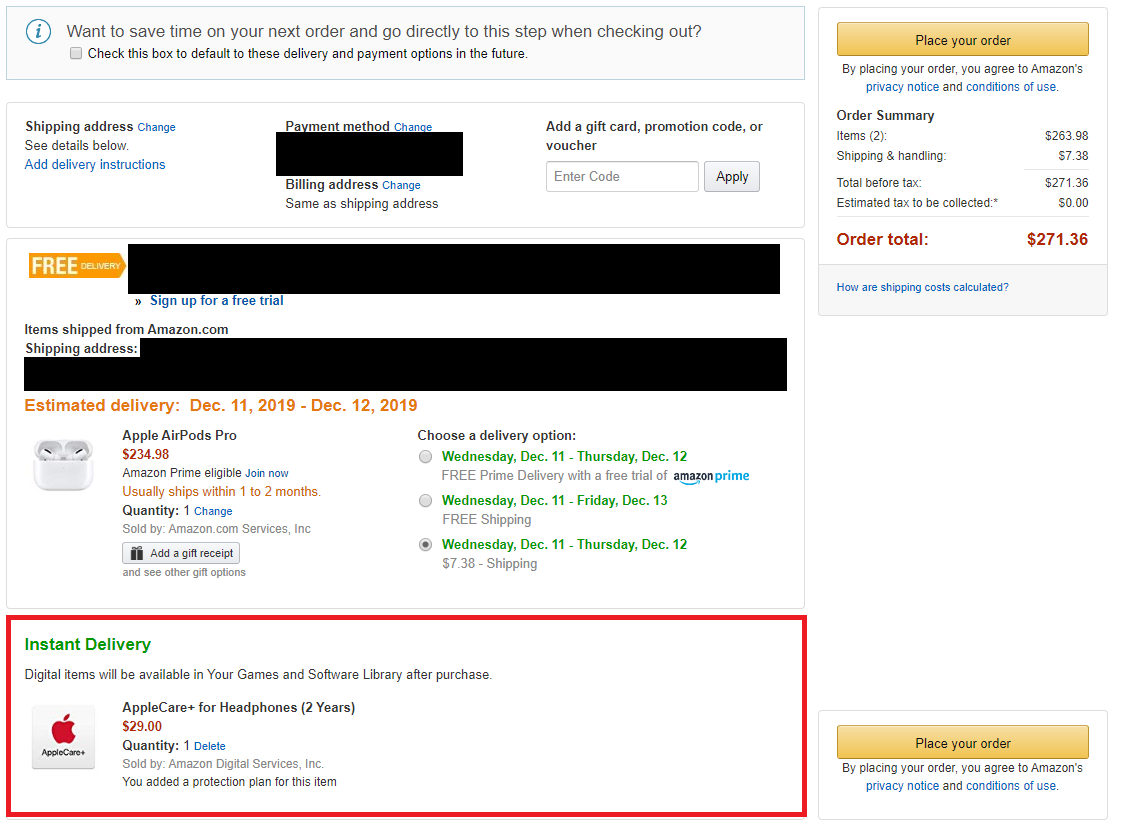 아마존에서 에어팟 프로 주문하면서 애플케어 추가하려다 에러가 생겼다. 한국에서 결제하면 45,000원이지만 아마존에서 에어팟 프로를 결제하면서 같이 구매하면 29달러이기에 기왕 하는 거 같이하고 싶었다. 그런데 에러 메시지가 발생했다.