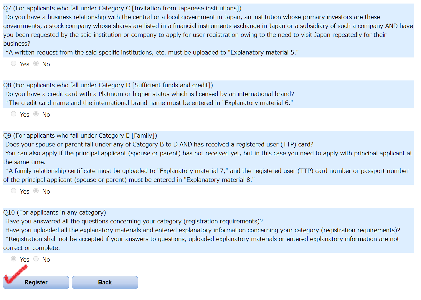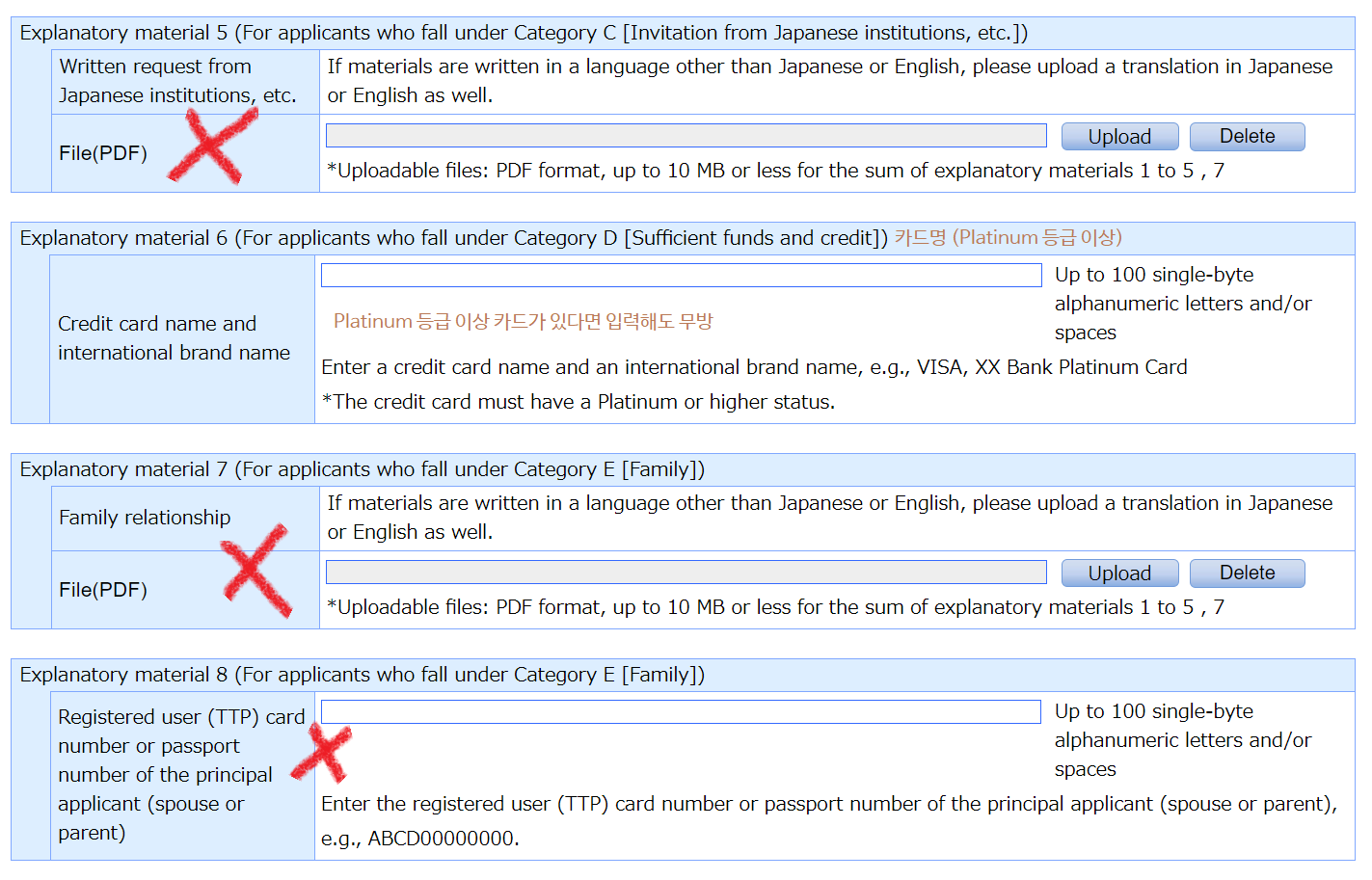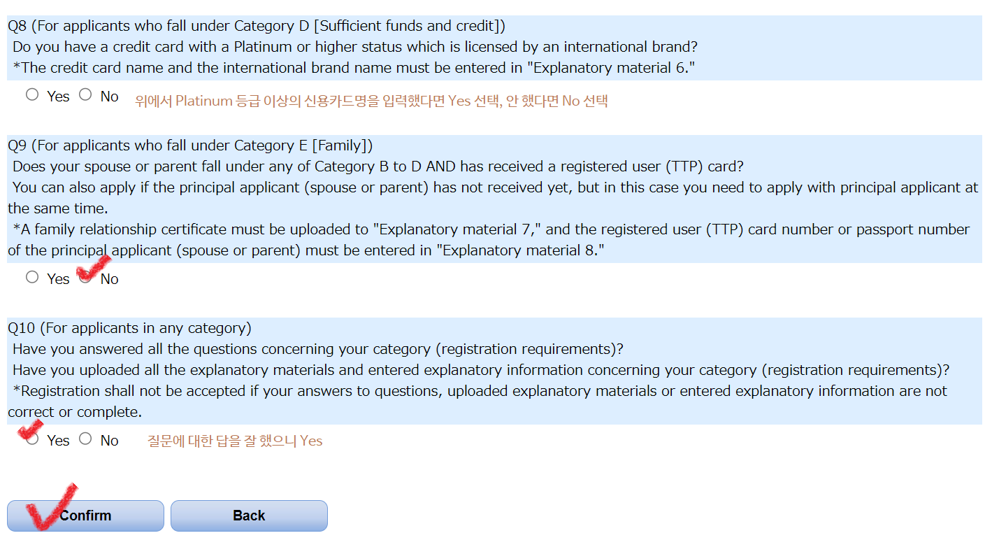 위에서 Explanatory material 6 칸에Platinum 등급 이상의 카드 이름을 작성했다면, 아래의 Q8에서 Yes를 체크해야 한다. 그렇지 않은 경우 No를 체크한다.