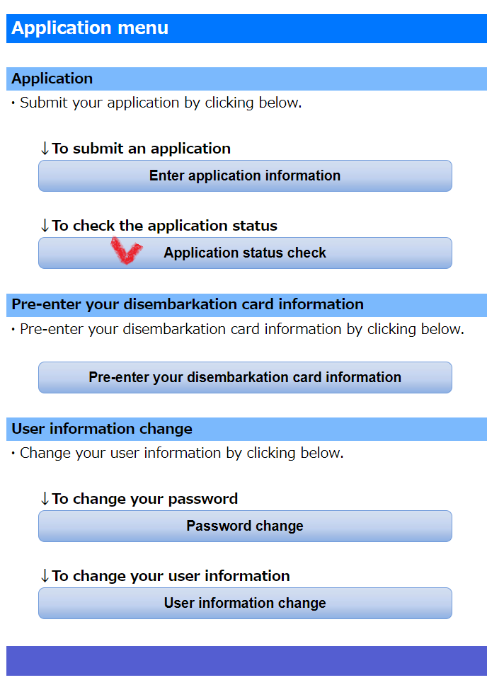 Yes 버튼을 누르면 사전입국정보 등록 페이지로 넘어가는데, TTP 발급 이전에는 전혀 필요 없는 페이지다. 신청은 완료되었으므로 창을 닫아도 되고 No를 눌러 메뉴 페이지로 돌아가도 된다.