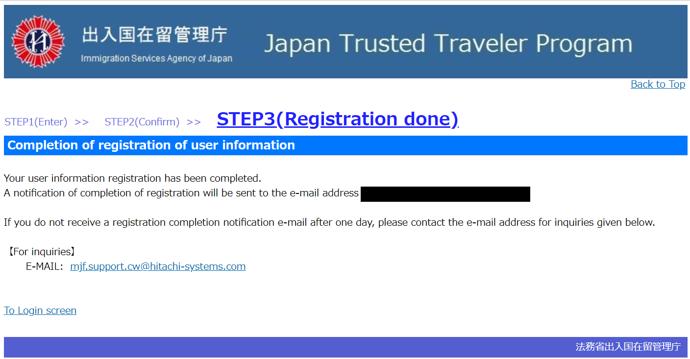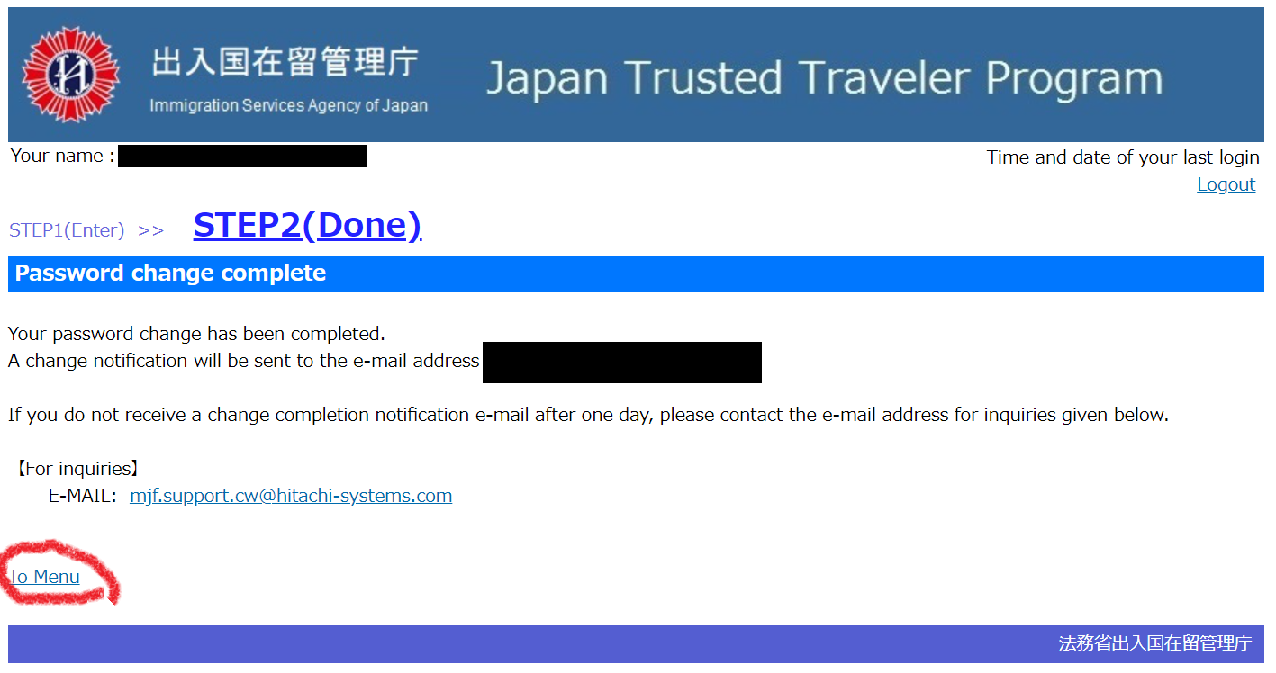 Register 버튼을 클릭하면 아래와 같은 페이지가 표시되며 사용자 등록(가입) 절차를 모두 마친 상태가 된다. 이제 진짜 TTP 신청 과정을 진행하기 위해 To Menu 버튼을 클릭하여 메인 페이지로 돌아간다.