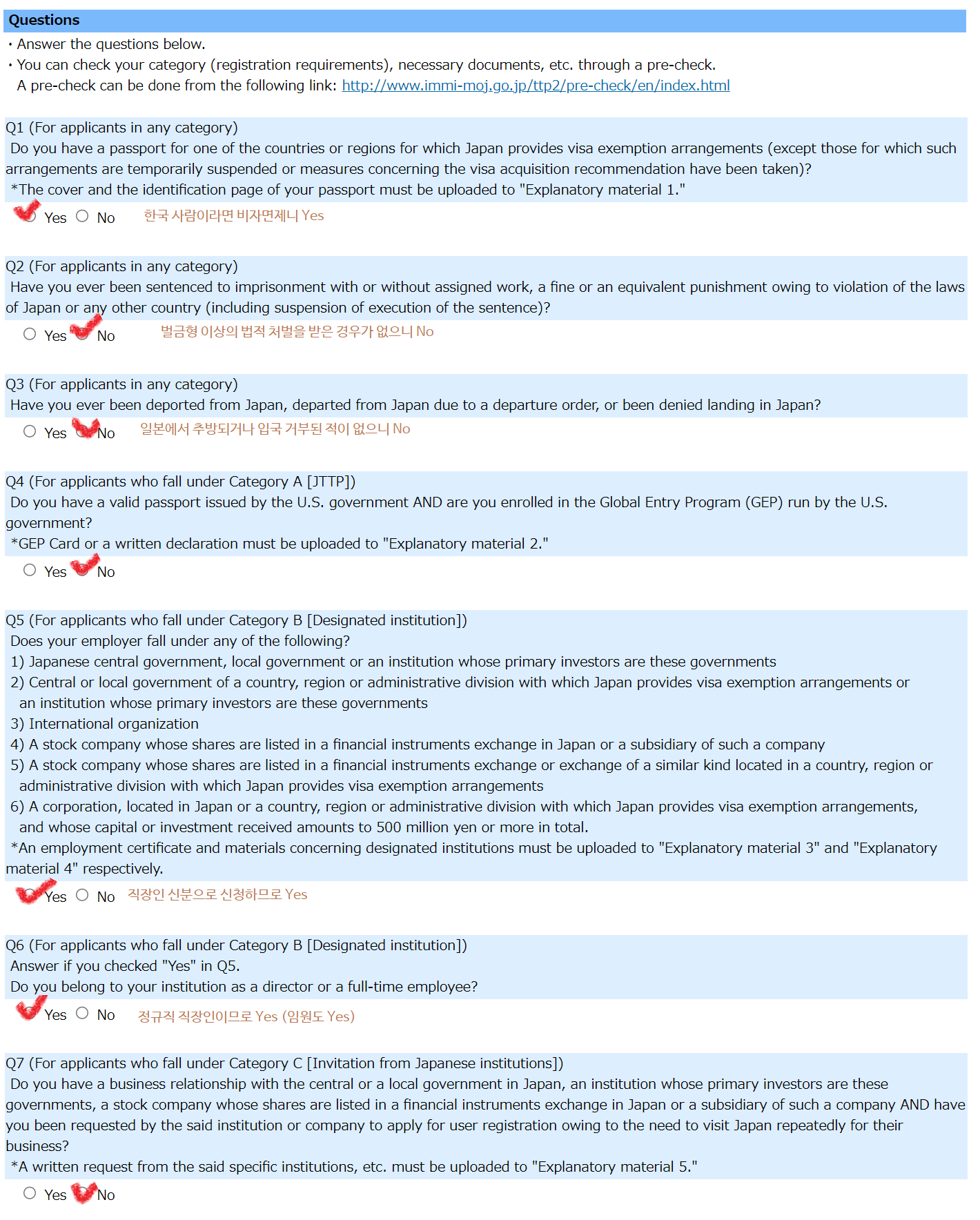 Pre-check에서 했던 질문 내용이고 본인에 해당되는 내용에 맞게 답변하면 된다.