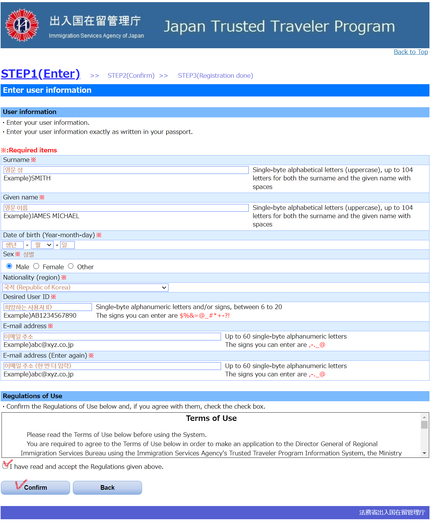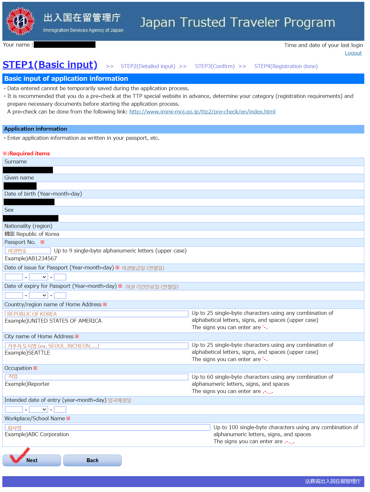 이름을 입력해야 하는데, 한자 이름을 넣어도 되고 카타카나로 넣어도 된다. 다만 한자 입력 시 일본에서 쓰지 않는 한국 한자의 경우 에러가 발생할 수 있으므로 카타카나로 입력하는 것을 추천한다. 본인 이름 발음에 맞게 적당히 입력.