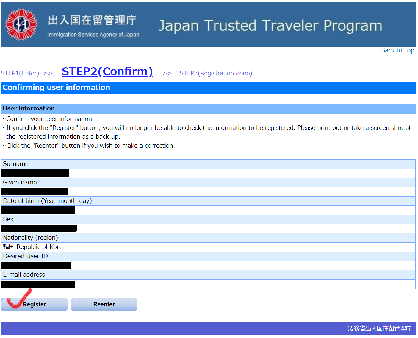 4. 입력한 내용이 맞는지 마지막으로 확인한 뒤 Register 클릭