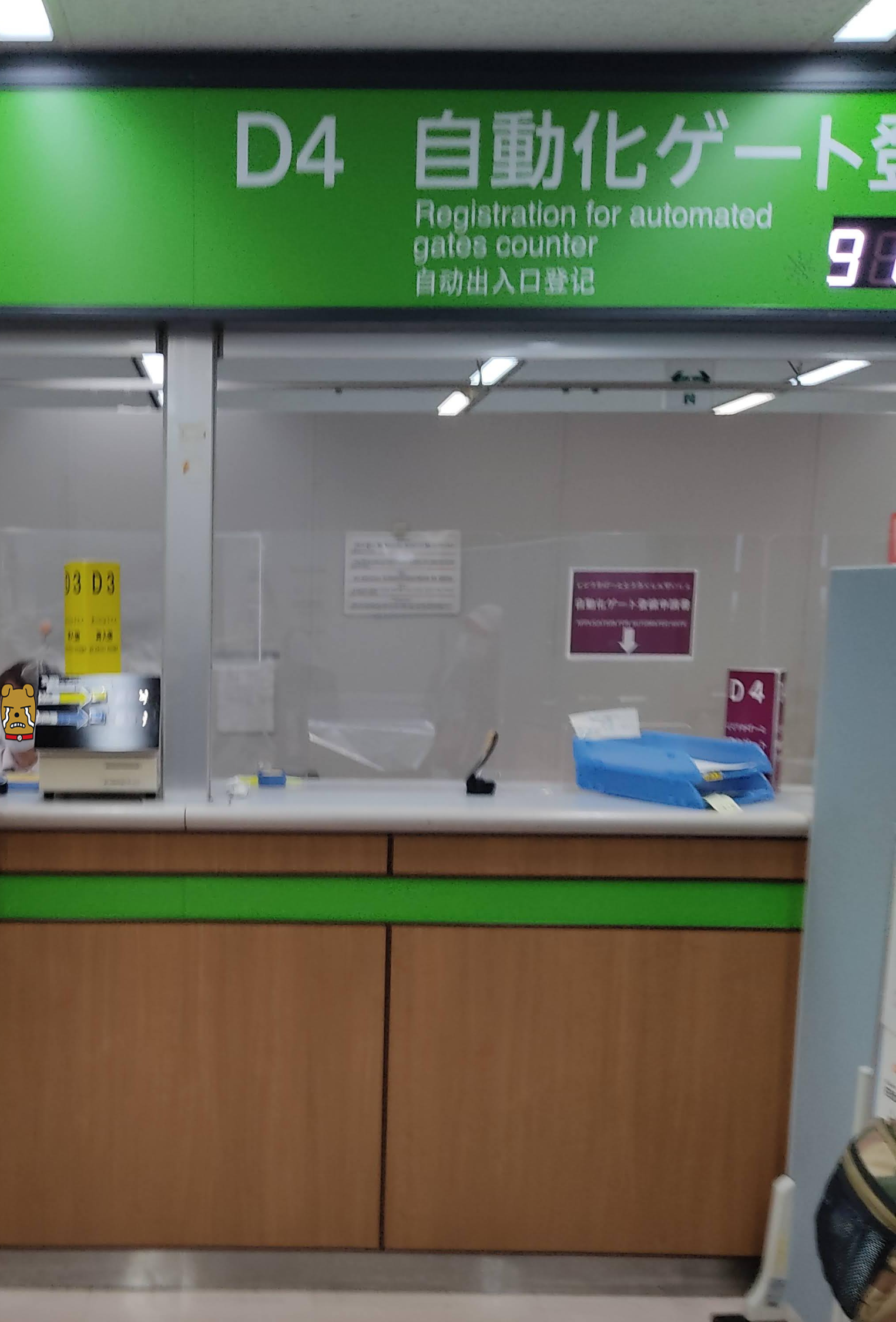 D3(재입국심사) 카운터 앞에 번호표 뽑는 기계가 있는데, 파란색 버튼을 눌러 번호표를 받은 뒤 기다렸다. 번호표는 D3, D4 (자동화게이트 등록)구분해서 뽑지만, 처리하는 공무원은 같은 사람이 하기에 D4 대기인원이 적어도 D3 대기인원이 많으면 한참 기다려야 하는 듯하다.