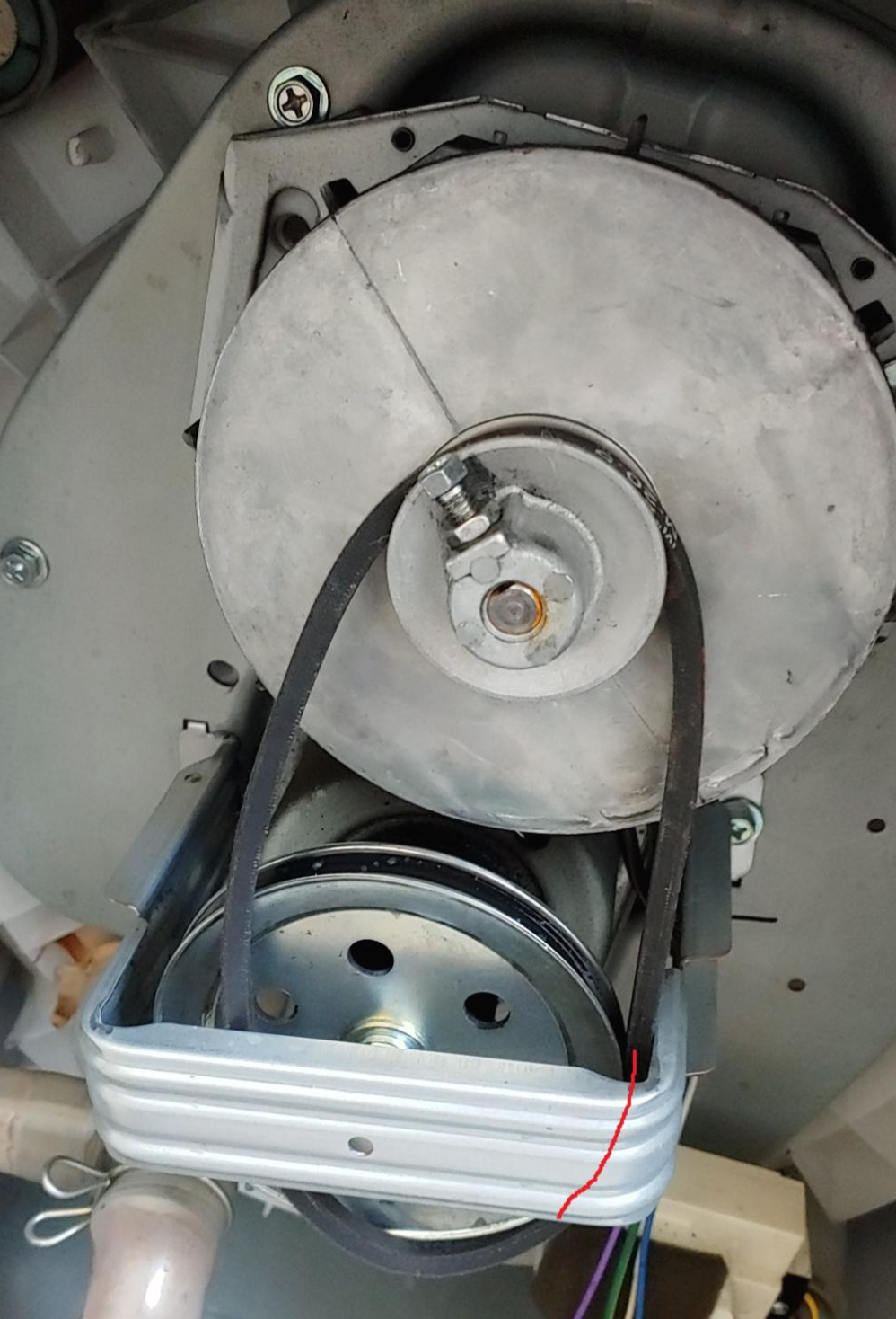 2. 빨간 선으로 표시한 작은 벨트 바퀴(벨트 풀리; belt pulley)에 V벨트를 장착한다.