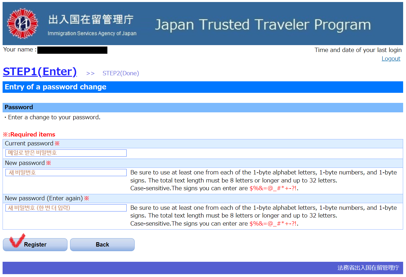 8. Current password 밑 빈 칸에 5번 단계에서 메일로 받은 비밀번호를 입력하고, New password와 New password (Enter again) 밑의 빈 칸에 새 비밀번호를 입력한 뒤 Register 클릭