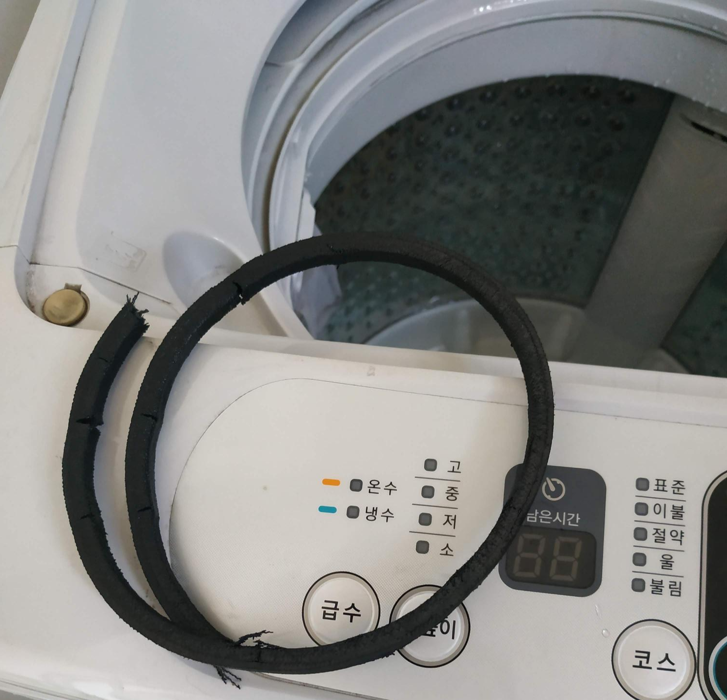 확인 결과 끊어진 벨트가 세탁기에 걸쳐져 있었다. 벨트 문제가 확실한 것 같습니다! 새로 안 사도 될 것 같다! 해피! 럭키! 스마일! 예! 벨트가 너덜너덜하다 못 해 끊어져있었다. 그래서 최대한 빨리 벨트를 사서 교체하기로 결정.